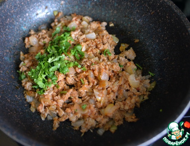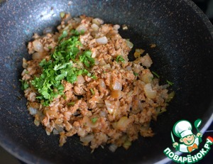 Кладём рубленную зелень кинзы или петрушки, перемешиваем, убираем остывать.
