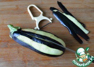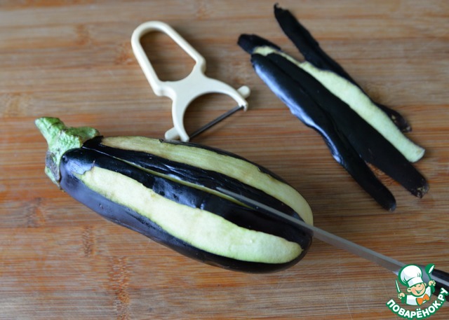 Баклажаны моем и чистим кожуру местами с помощью овощечистки. Делаем ножом продольный разрез вдоль, не дорезая до конца и хвостика баклажана.