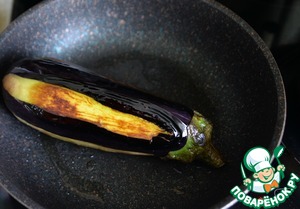 Ставим сковороду на огонь, вливаем 1 ст. л. растительного масла и обжариваем баклажаны со всех сторон по 5 минут с каждой, переворачивая плоды.