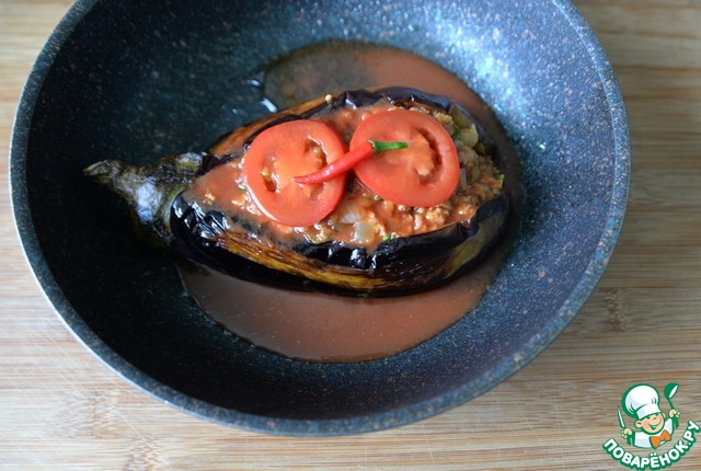 Помидор режем кружочками и кладём кружочки поверх каждого баклажана. Перец чили кладём поверх помидоров, ориентируйтесь по своему вкусу и остроте перца чили. Из 1 ст. л. томатной пасты и 100 мл воды делаем заливку и поливаем ею баклажаны. Отправляем форму (сковороду) с баклажанами в разогретую до 190 градусов духовку на 20 минут.