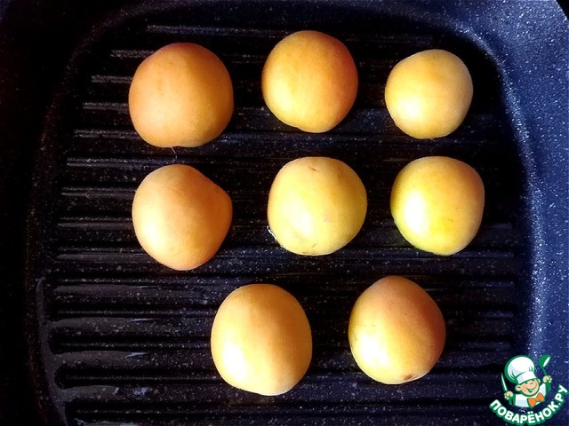 Абрикосы можно "погрилить" на сковороде-гриль, на эл. гриле или на решётке мангала, где на природе у вас что будет. Я использую сковороду-гриль. Греем её и подмазываем рёбра сковороды. Абрикосы нужно разрезать пополам и вынуть косточку. Срезами отправляем на горячий гриль. Держим там до красивых полосочек.