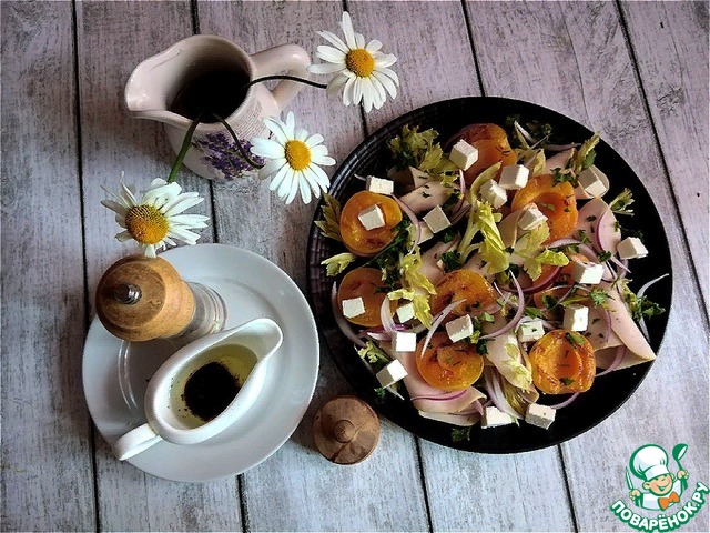 Теперь собираем салат празднично. Я возьму большое блюдо, выложу на него со сковороды-гриль абрикосы. Пусть остынут, пока займусь другими ингредиентами. Ветчину в ломтиках я разрежу пополам поперёк. Получится 8 ломтиков. Каждый сверну аккуратным кулёчком и разложу по блюду рядом с абрикосами. Присыплю рубленной петрушкой, листиками сельдерея, красным луком, порезанным перьями тонкими. Брынзу нарезаем небольшими кубиками и тоже раскладываем поверх. Делаем заправку. Оливковое масло я смешала с тёмным бальзамиком. Можно взять бальзамический уксус. Поперчила и размешала.