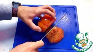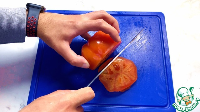 Затем помидор нарезаем тонкими слайсами.