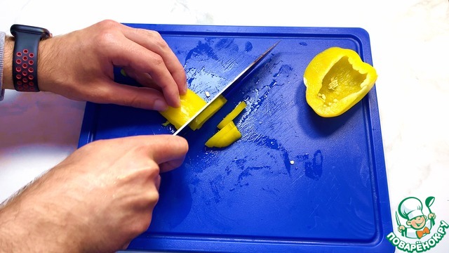 У болгарского перца убираем плодоножку и мякоть нарезаем тонкими полосочками.
