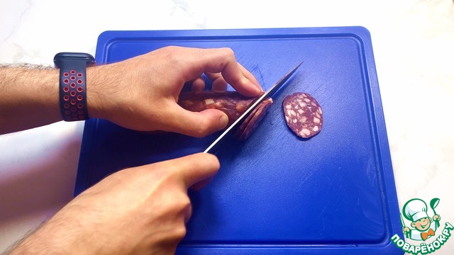 Сыровяленую колбасу нарезаем тонкими колечками.
