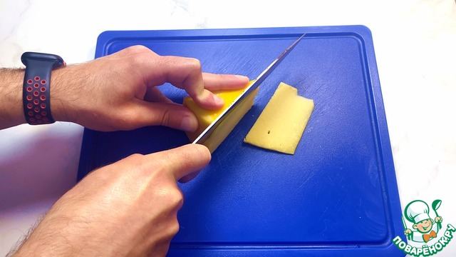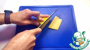 Сыр нарезаем на тонкие пластинки.