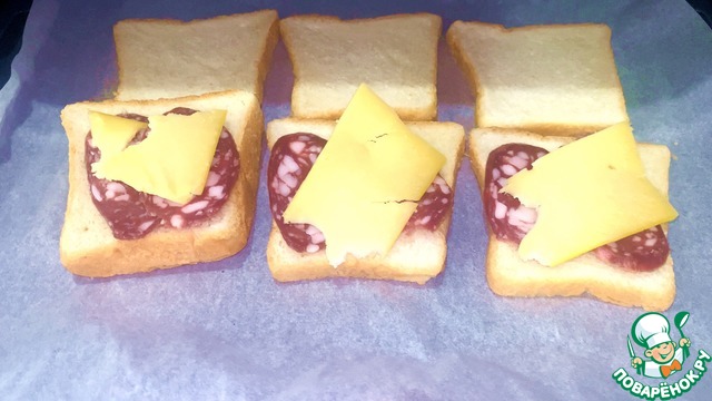 После чего на хлеб кладем сыр с колбасой и отправляем в духовой шкаф, разогретый до 200 градусов на 5 минут.