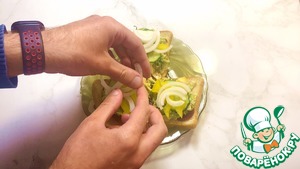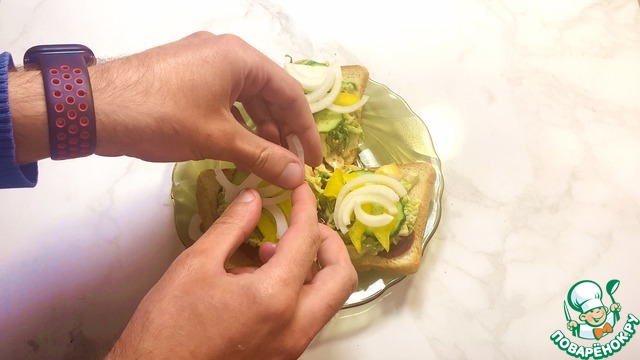 Затем на хлеб кладем колслоу, колечки огурца, болгарский перец, лук, слайсы помидоров.
