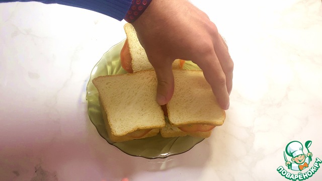 Поливаем сэндвич острым соусом, кетчупом и накрываем ломтиками хлеба.