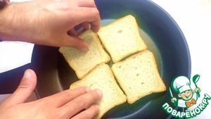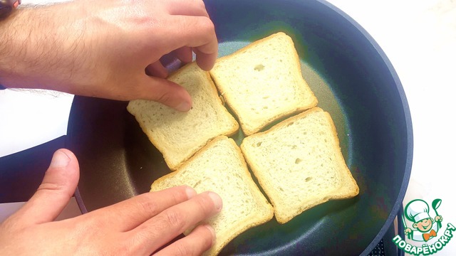 Потом хлеб поджариваем на сухой сковороде до образования румяной корочки.