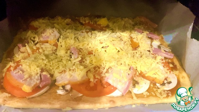 Затем корж смазываем BBQ соусом, выкладываем начинку, посыпаем сыром и отправляем в духовой шкаф разогретый до 180 градусов на 10 минут.