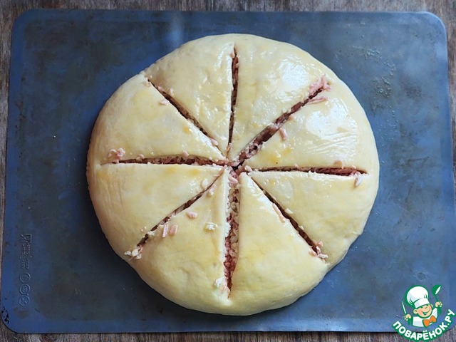 Сделать 8 надрезов острым ножом, не прорезая край пирога (как на фото).
