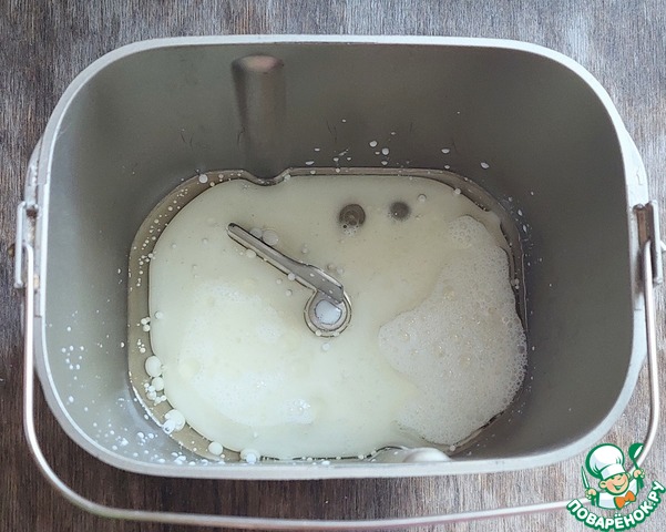 Тесто я буду готовить в хлебопечке. В ведёрко хлебопечки влить тёплое молоко, добавить сахар, соль, растительное масло. Желток отделить от белка. Белок отправить в тесто.