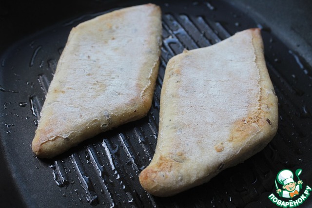 На поджаренную сторону булочки выкладываем ветчину (я разрезала ветчину на два треугольника), моцареллу, ветчину, моцареллу.