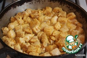 Итак, нарезаем наше филе кубиками. Совет: если филе слегка подморозить, оно будет резаться легче, а вкус от этого совершенно не пострадает