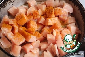 Разогреваем на сковородке растительное масло и выкладываем курочку. Будет очень неплохо, если вы добавите специй. Я взяла уже готовую смесь специй "Для курицы". Если нет смеси, добавляйте куркуму (для цвета), имбирь (для вкуса) и сушеный чеснок (для аромата)