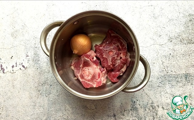 В кастрюлю, я готовила в этот раз дома, налейте воду и положите вымытые кусочки баранины и одну вымытую луковицу прямо в шелухе.