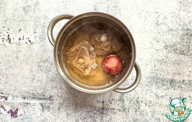 Доведите все до кипения, удалите пену и варите на самом маленьком огне до того как мясо хорошо начнет отделяться от косточек, луковицу удалите. На это уйдет от 1 до 2 часов. Не закрывайте кастрюлю крышкой, суп получится мутным и не наваристым, ведь вода не будет испаряться.