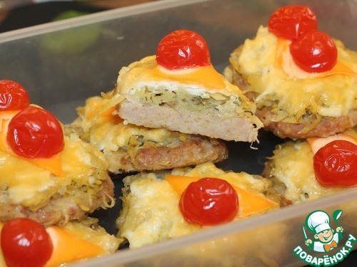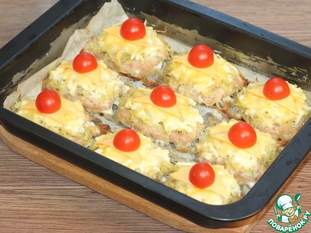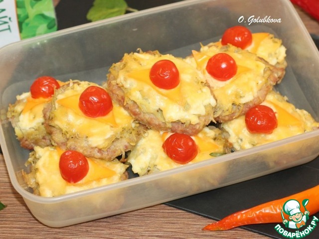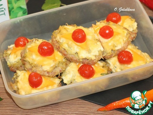 16. Ставим форму в духовку и запекаем котлеты при 180 С, 30 минут. Затем смазываем взбитым желтком и украшаем полосками плавленного сыра и помидорами черри.