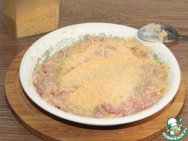 5. Добавляем панировочные сухари, приправу для птицы (0,5 ч. л.) и специи, перемешиваем.