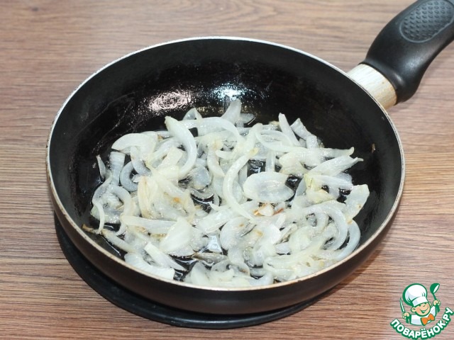 8. 1/2 часть лука нарезаем полукольцами и обжариваем на растительном масле до "прозрачности". Перекладываем лук в миску.