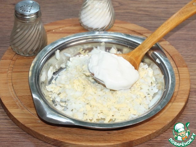 10. Вареное яйцо натираем на крупной терке и смешиваем со сметаной, солим по вкусу.