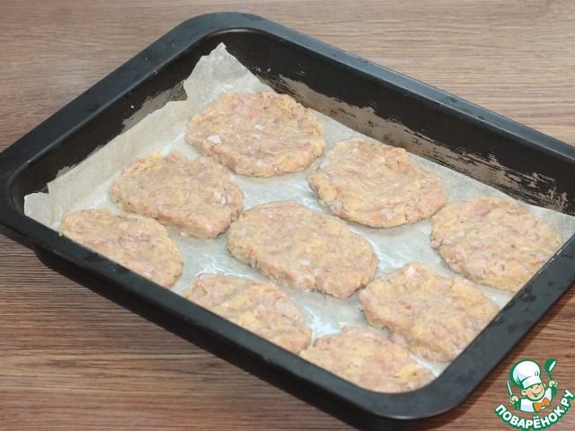 11. Форму для запекания застилаем пекарской бумагой и смазываем растительным маслом. Из фарша формируем продолговатые котлетки и выкладываем в форму.