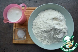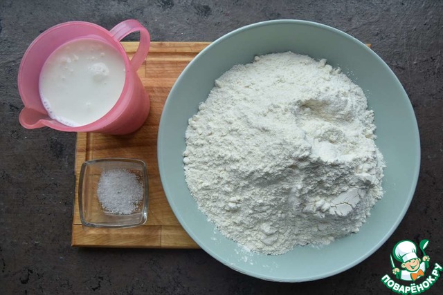 Для теста просеиваю через сито муку. В качестве кисломолочной составляющей использую кефир 2,5% жирности.