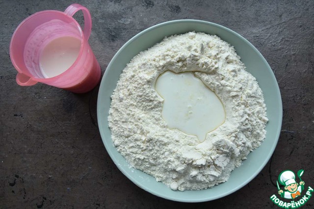 В центре горки из муки формирую воронку, куда вливаю кефир и добавляю соль.