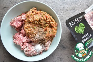 Овощную массу перекладываю к фаршу. Солю, перчу, добавляю томатную пасту и хорошо перемешиваю начинку.