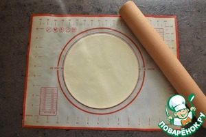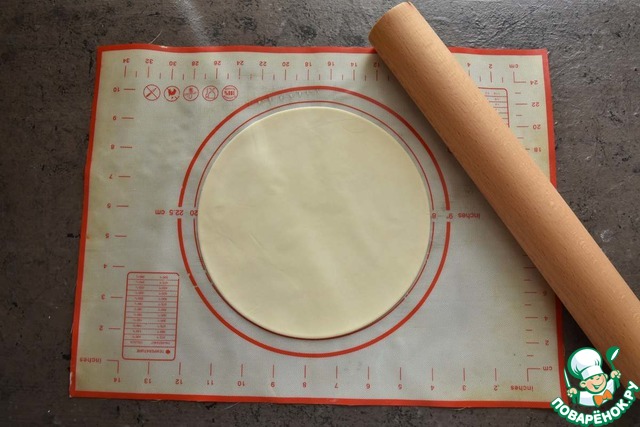 Порцию теста, примерно 100-110 граммов раскатываю в лепешку толщиной 2-3 мм.