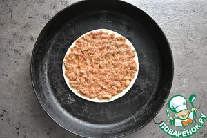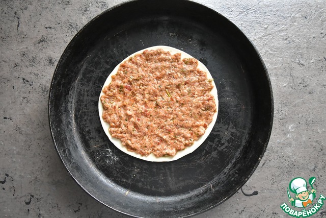 Сверху на тесто выкладываю 2 ст. л начинки из фарша баранины и овощей. Распределяю тонким слоем по всей поверхности лепешки, оставляя 1 см от края.