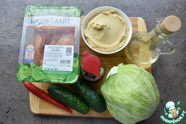 Для приготовлния рулетиков с листьями салата Айсберг, индейки, салатом из огурцов и хумусом готовлю продукты.