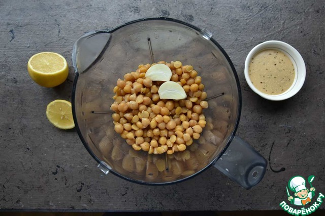 К нуту в измельчитель добавляю зубчик чеснока, сок лимона, соль и кунжутную пасту.