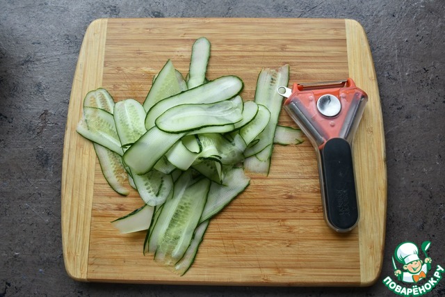 Для этого нарезаю огурцы ленточками с помощью овощечистки.