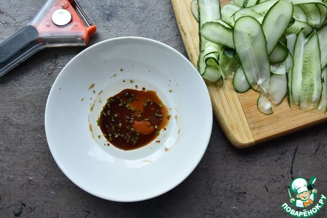 Помещаю ленточки из огурца в маринад и перемешиваю. -