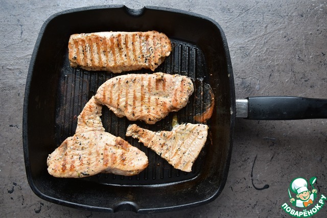 Филе индейки "по- мексикански" от ТМ Индилайт содержит маринад специи и соль, поэтому его остается только обжарить на раскаленном гриле с двух сторон 2-3 минуты, до характерных грильных полосочек.