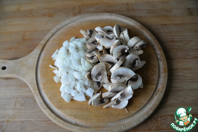 Лук чистим, грибы моем, обсушиваем. Лук режем мелкими кубиками, шампиньоны ломтиками.