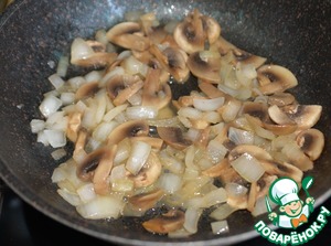 На горячую сковороду наливаем масло, кладём лук и грибы. Обжариваем 2 минуты на сильном огне.