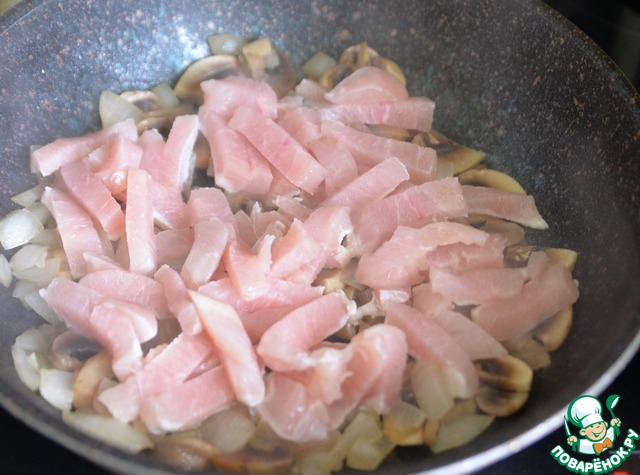 Кладём индейку, обжариваем 10 минут на среднем огне, периодически перемешивая.