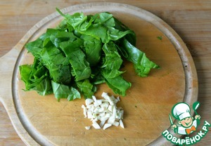 Шпинат моем, обсушиваем, режем полосками. Можете брать замороженный. Чеснок чистим, мелко рубим.