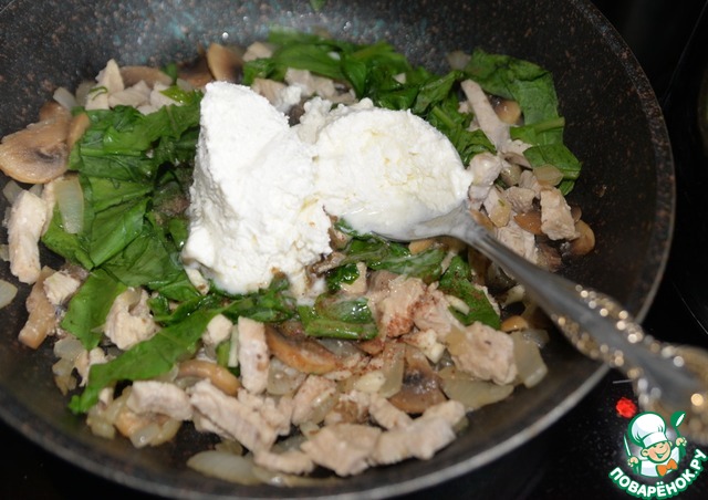 Кладём шпинат и чеснок на сковороду, добавляем соль, мускатный орех, чёрный перец, перемешиваем.