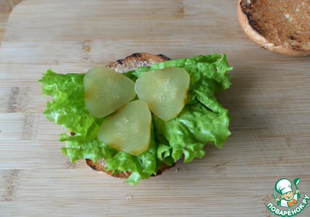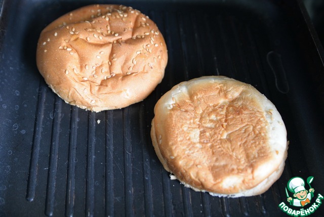 Булочку для бургера разрезаем пополам вдоль, подсушиваем разрез на сковороде-гриль.