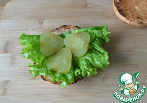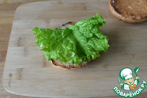 Смазываем нижнюю часть сладкой горчицей, кладём лист салата.