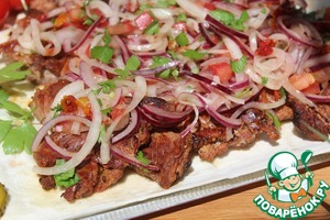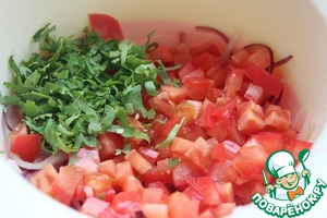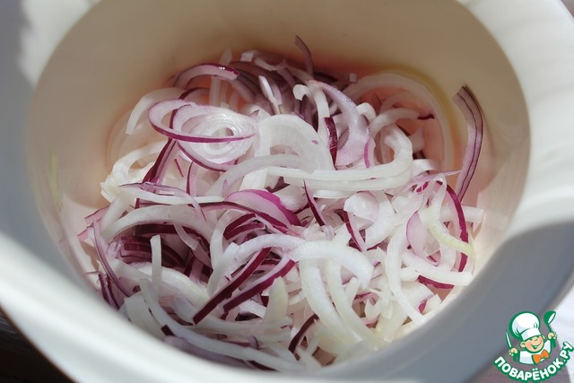 У меня был репчатый ядреный лук, поэтому я посыпала лук 1 ч л с горкой сахара, посыпала солью, влила сок половинки лайма и чуть помяла.