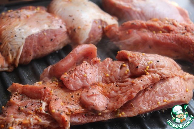 Ожариваем индейку с двух сторон на гриле до готовности, у меня контактный гриль, поэтому у меня обжаривалась индейка сразу с двух сторон.