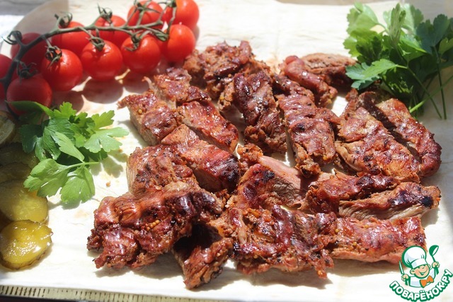 Она в маринаде, куски довольно большие, поэтому разрезала на несколько частей и обсушила. -