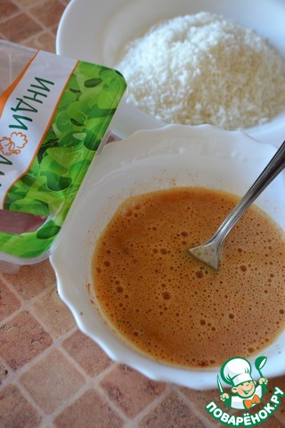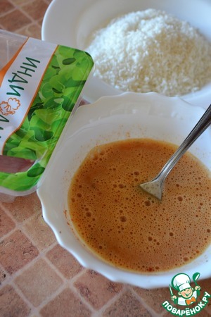 • Яйца взбить вилкой с чёрным перцем и паприкой. Кокосовую стружку высыпать в тарелку с небольшим дном.