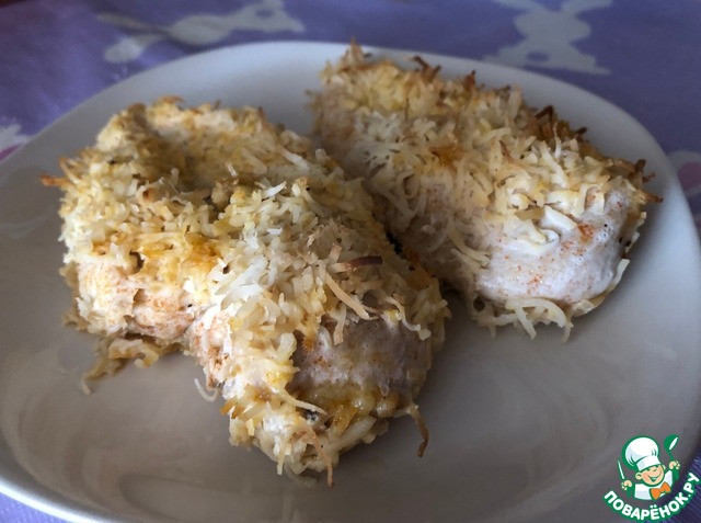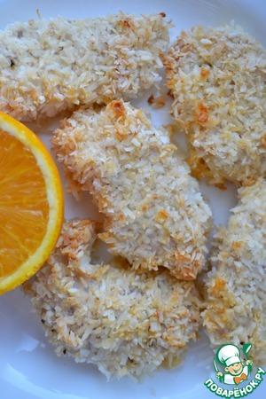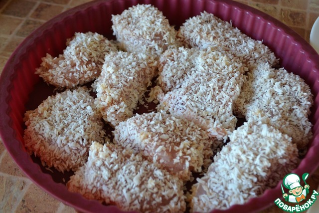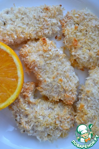 • Стейки обмакнуть в яичную смесь, а затем обвалять в кокосовой стружке. Выложить индейку в форму для выпечки. Я использую силиконовую форму. Запечь при 180° в течение 35 минут. Аромат будет стоять восхитительный!
