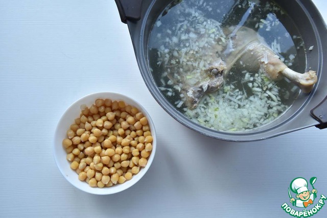 Добавляю в бульон полуготовый нут и варю его около 15 минут.